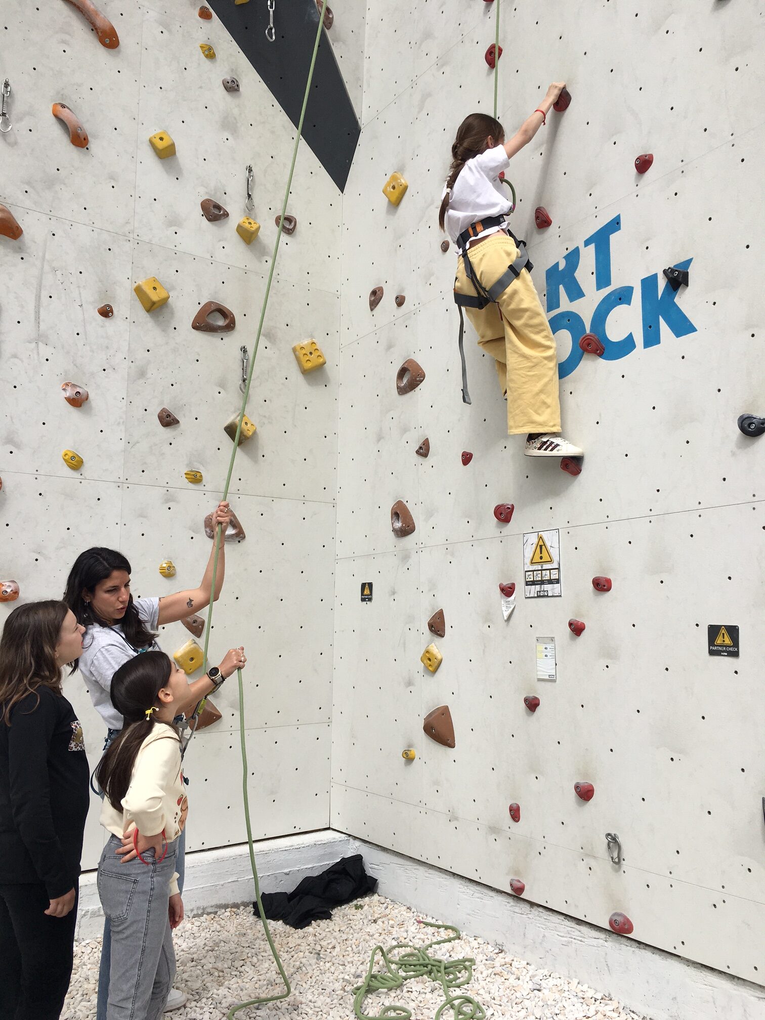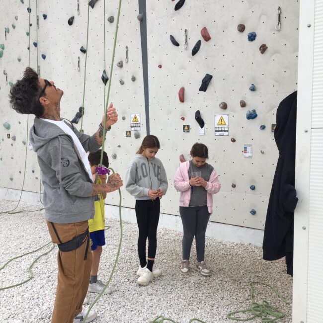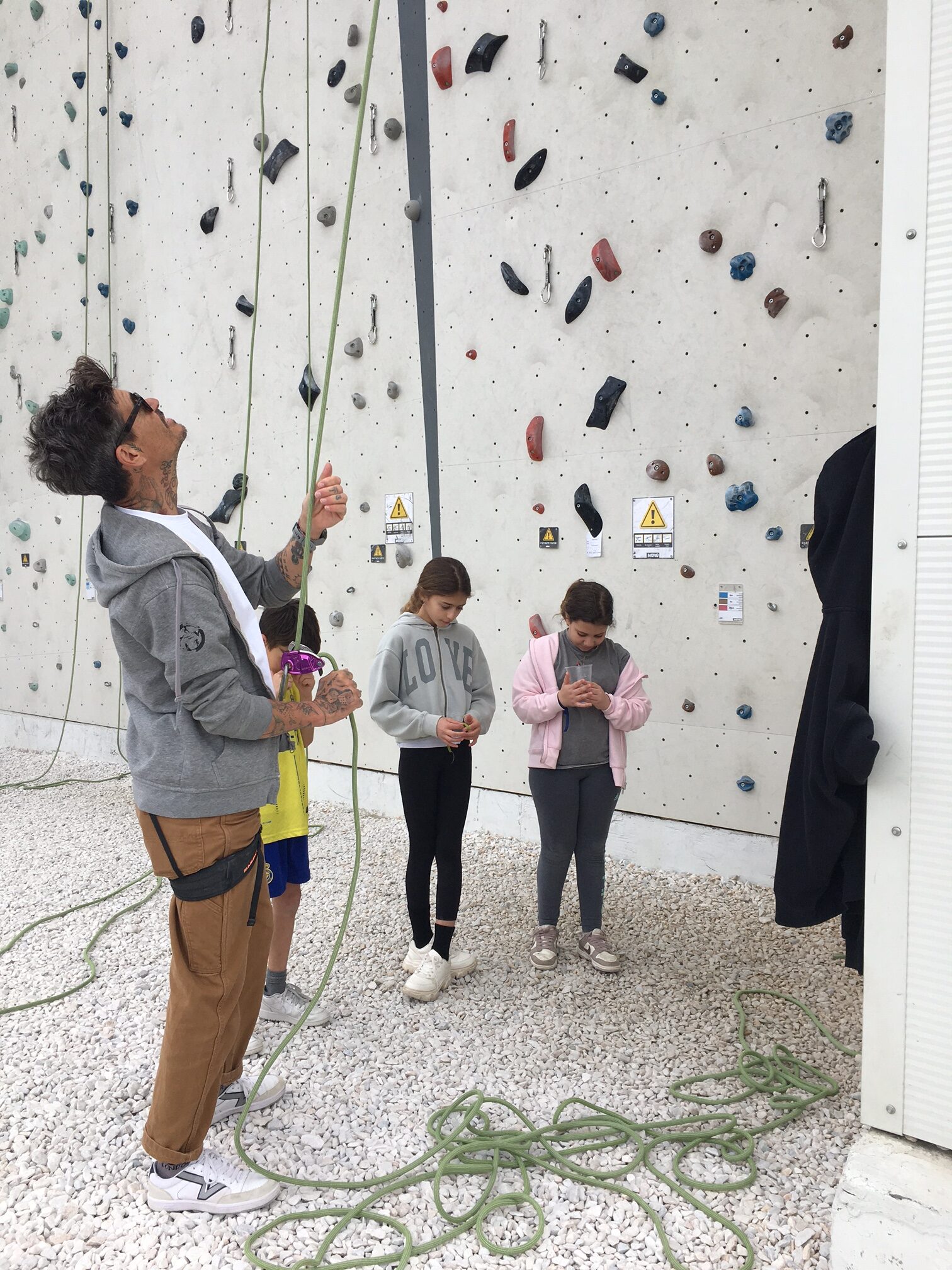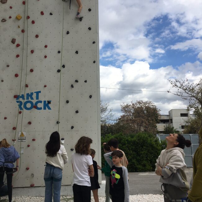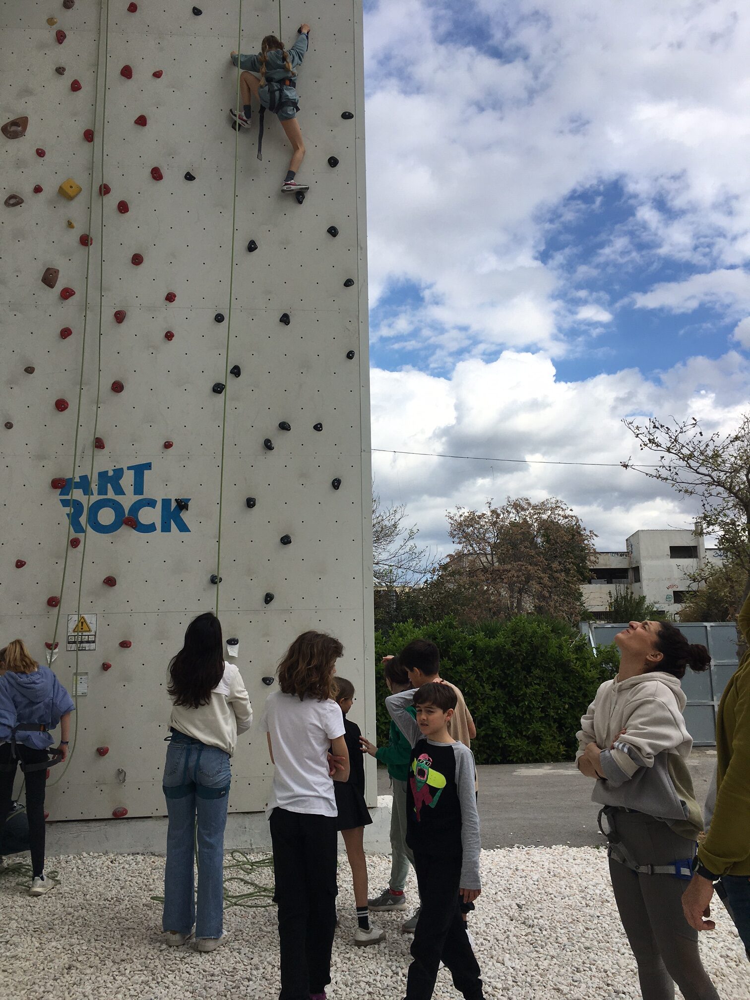 Αναρρίχηση: τα παιδιά θα σκαρφαλώσουν με σχοινί στον εξωτερικό μας τοίχο, που είναι ο,τι πιο κοντινό στην αναρρίχηση σε εξωτερικό περιβάλλον. Κάθε διαδρομή και μια διαφορετική περιπέτεια!